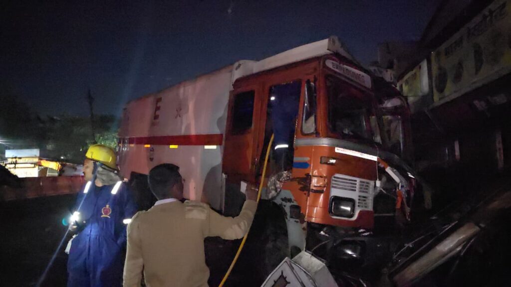 भिलाई-3। रायपुर की ओर जा रहा बारूद से लदा एक ट्रक (वाहन क्रमांक TS 05 UB 2355) गुरुवार को भिलाई-3 के पास अनियंत्रित होकर एक बिजली के ट्रांसफार्मर से जा टकराया. टक्कर इतनी जोरदार थी कि ट्रक सर्विस रोड पर उतर गया और उसके केबिन में भीषण आग लग गई. बारूद की मौजूदगी के कारण एक बड़े विस्फोट का खतरा मंडरा रहा था, जिसे दमकल विभाग की तत्परता ने टाल दिया.