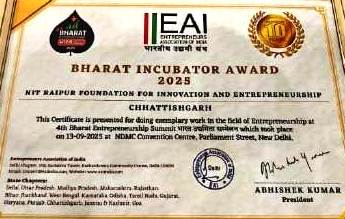 नवाचार और उद्यमिता में छत्तीसगढ़ को मिली राष्ट्रीय पहचान, एनआईटी रायपुर एफआईई को मिला ‘भारत इन्क्यूबेटर अवार्ड’