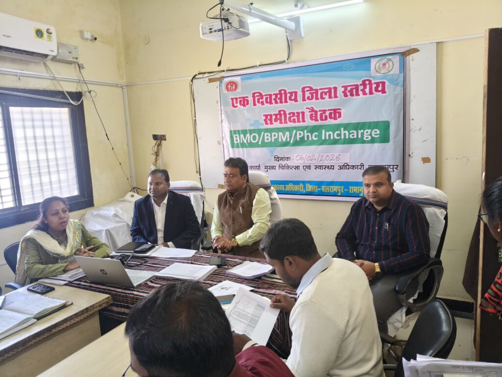 बलरामपुर-रामानुजगंज। आज दिनांक 06 फरवरी 2026 को मुख्य चिकित्सा एवं स्वास्थ्य अधिकारी सभाकक्ष में जिले की स्वास्थ्य सेवाओं के सुदृढ़ीकरण एवं केंद्र व राज्य सरकार द्वारा संचालित विभिन्न राष्ट्रीय स्वास्थ्य कार्यक्रमों की प्रगति की समीक्षा हेतु जिला स्तरीय समीक्षा बैठक का आयोजन किया गया। बैठक की अध्यक्षता संयुक्त संचालक, स्वास्थ्य सेवाएं डॉ. अनिल शुक्ला द्वारा की गई।