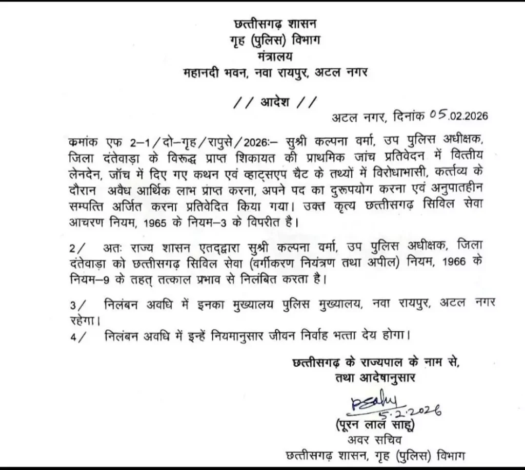 रायपुर। राजधानी रायपुर में सामने आए डीएसपी कल्पना वर्मा और होटल कारोबारी दीपक टंडन से जुड़े विवाद ने नया मोड़ ले लिया है। मामले की प्राथमिक जांच रिपोर्ट सामने आने के बाद राज्य सरकार ने कार्रवाई करते हुए डीएसपी कल्पना वर्मा को निलंबित कर दिया है। गुरुवार को जारी आदेश में कहा गया कि प्रारंभिक जांच में गंभीर अनियमितताओं के संकेत मिले हैं, जिसके आधार पर यह निर्णय लिया गया।