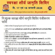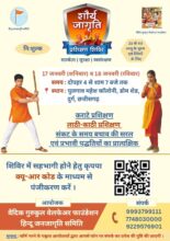 हिंदु जनजागृति समिति एवं वैदिक गुरुकुल वेलफेअर फाउंडेशन आयोजित नि:शुल्क शिविर का आयोजन किया गया है | युवाओं मे योद्धा वृती निर्माण हो इस हेतु निःशुल्क शौर्य जागरण प्रशिक्षण शिविर का आयोजन किया गया है | इस प्रशिक्षण को लेकर और स्कूल कॉलेज में जाकर बताया जा रहा है|