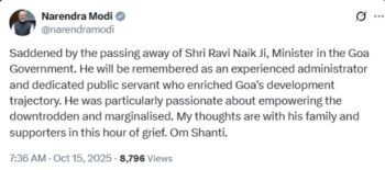 “गोवा सरकार में कृषि मंत्री रहे रवि नाइक जी के निधन से गहरा दुख हुआ। उन्होंने एक समर्पित लोकसेवक और अनुभवी प्रशासक के रूप में गोवा की प्रगति में महत्वपूर्ण योगदान दिया। उनका जीवन समाज सेवा को समर्पित था। ईश्वर उनके परिजनों और समर्थकों को इस कठिन समय में शक्ति दें। ॐ शांति।”