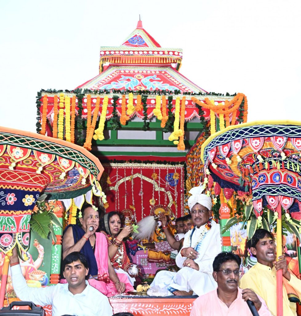 मुख्यमंत्री साय ने हजारों श्रद्धालुओं के साथ भक्तिभावपूर्वक रथ यात्रा में भाग लिया। श्रद्धालुओं ने भगवान श्री जगन्नाथ, भाई बलभद्र एवं बहन सुभद्रा के रथ को रस्सी खींचकर आगे बढ़ाया। पूरा वातावरण जय जगन्नाथ के जयघोष, भजन-कीर्तन और भक्तिमय उल्लास से गूंज उठा। रथ यात्रा मुख्य मार्गों से होते हुए मौसीबाड़ी पहुंची। भगवान श्री जगन्नाथ, भाई बलभद्र एवं बहन सुभद्रा नौ दिनों तक अपनी मौसी के घर मौसीबाड़ी में विराजमान रहेंगे। नौवें दिन 5 जुलाई को शुभ वापसी श्री जगन्नाथ मंदिर, दोकड़ा में होगी। यह आयोजन ओडिशा के पुरी धाम की परंपरा के अनुरूप आयोजित किया गया है।