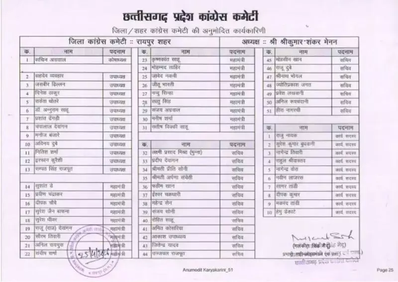 रायपुर: छत्तीसगढ़ की राजधानी रायपुर में शहर जिला कांग्रेस कमेटी की नई कार्यकारिणी की घोषणा कर दी गई है। पार्टी की इस नई सूची को प्रदेश कांग्रेस कमेटी (PCC) अध्यक्ष की मंजूरी के बाद शहर जिला अध्यक्ष श्रीकुमार मेनन द्वारा जारी किया गया है।