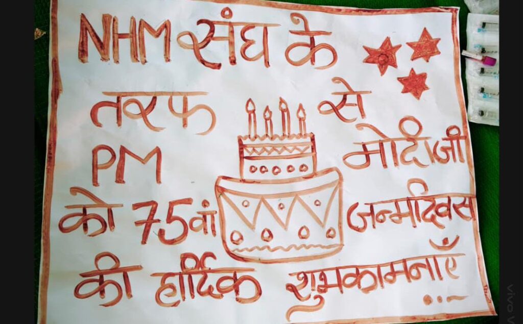 लोकतंत्र प्रहरी /छत्तीसगढ़.दुर्ग दुर्ग । राष्ट्रीय स्वास्थ्य मिशन (एनएचएम) के कर्मचारियों द्वारा 17 अगस्त से किया जा रहा अनिश्चितकालीन आंदोलन बुधवार को 31वें दिन भी जारी रहा.हर बार की तरह आज विरोध प्रदर्शन अनोखा रहा 17 सितम्बर को प्रधानमंत्री नरेंद्र मोदी का 75वां जन्मदिन पर . आंदोलनरत कर्मचारियों ने आंदोलन स्थल पर केक काटा, रक्तदान किया, गरीबों को फल और मिठाई बांटी और अपने खून से प्रधानमंत्री के लिए बधाई संदेश भी लिखा।