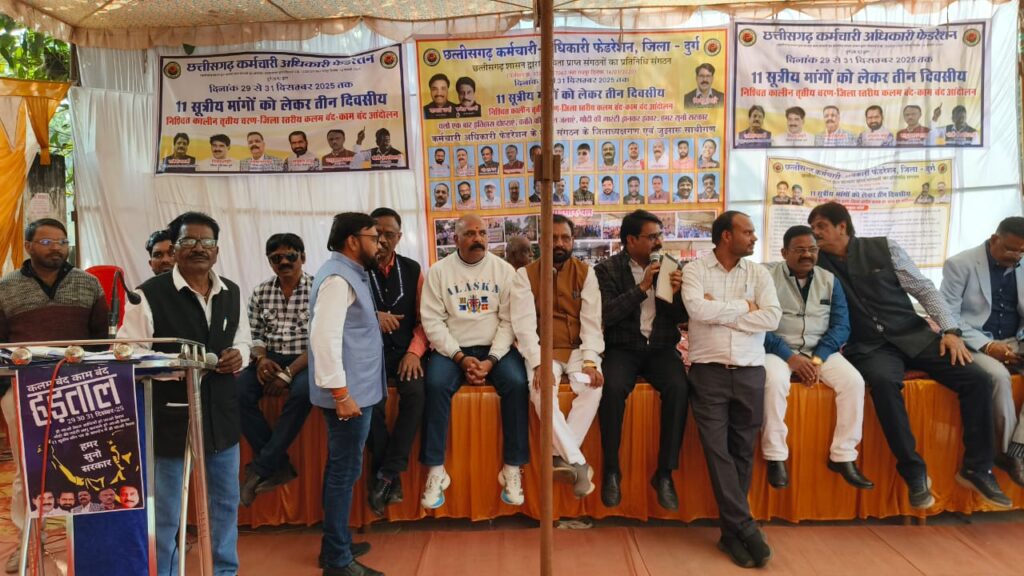 सरकार के कर्मचारियों के लिए की गई घोषणा के सभी मुद्दों को लेकर छत्तीसगढ़ कर्मचारी – अधिकारी फेडरेसन एवं फेडरेसन से संबद्ध संगठनों के सभी सम्माननीय पदाधिकारी गण अपने विभागीय कर्मचारी साथियो सहित तीन दिवसीय कलमबंद हड़ताल पर बैठे हुए हैं।