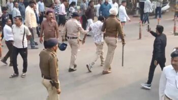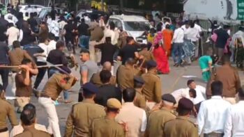 स्थिति तब और तनावपूर्ण हो गई जब भीड़ में से किसी ने पुलिसकर्मियों पर डंडा-युक्त झंडा फेंककर चोट पहुंचाने की कोशिश की और पानी की बोतलें भी फेंकीं।