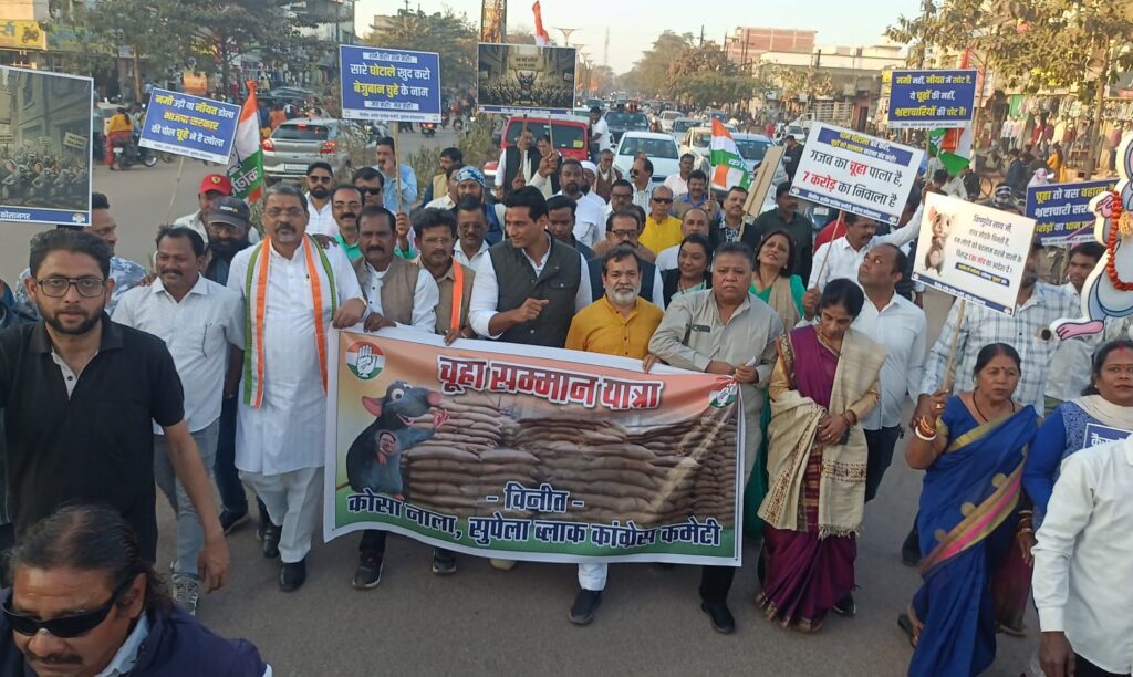 “चूहा सम्मान रैली” राजेंद्र प्रसाद चौक से सुपेला घड़ी चौक तक निकाली गई। इस दौरान कांग्रेस नेताओं ने सरकार पर तीखा हमला करते हुए कहा कि धान के करोड़ों रुपये के नुकसान की जिम्मेदारी चूहों पर डालना जनता को गुमराह करने का प्रयास है। रैली में प्रतीकात्मक रूप से चूहों का “सम्मान” कर विरोध दर्ज कराया गया और न्याय की मांग की गई।
