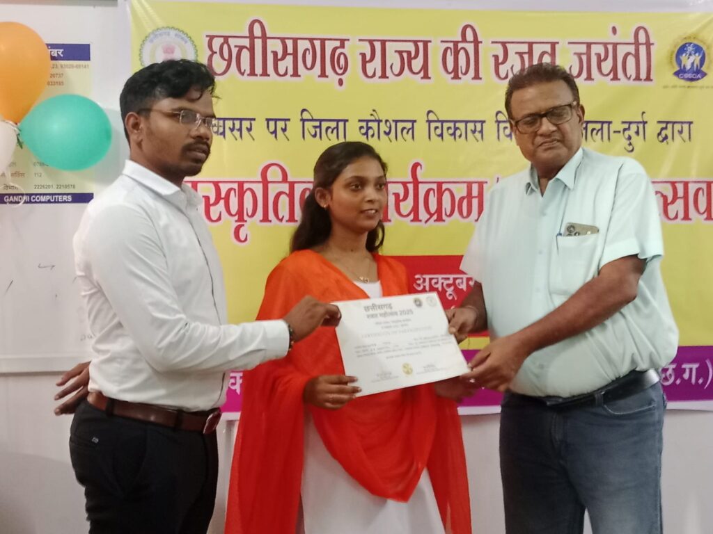 चार अलग अलग तरह की आयोजित स्पर्धा के प्रतिभागियों को प्रमाण पत्र भी दिया गया।इस अवसर पर उपस्थित अतिथि  उत्तम ध्रुव, डिप्टी कलेक्टर दुर्ग एवं नोडल अधिकारी व्ही. के. केडिया उप संचालक रोजगार एवं सहायक संचालक, जिला कौशल विकास प्राधिकरण दुर्ग के द्वाराप्रशिक्षणार्थियों को प्रमाण पत्र का वितरण किया गया। और छात्र छात्राओं की उज्ज्वल भविष्य की अतिथियों ने शुभकामनायें दी. इस अवसर पर  समस्त VTP के संचालक और प्रशिक्षणार्थी उपस्थित रहे।