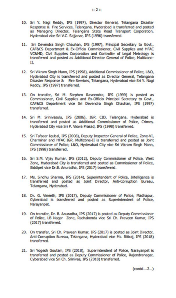 Anil Kumar was posted as Additional Director General of Police (Operations), Greyhounds & Octopus. Shikha Goel, Director, TG Cyber Security Bureau, Hyderabad was transferred and posted as Director General, Vigilance & Enforcement.