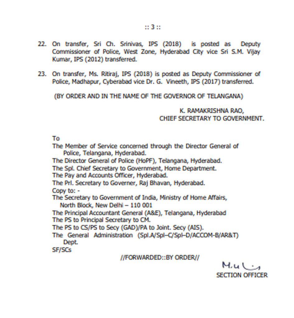 Charu Sinha, Additional Director General of Police, CID, was placed in full additional charge of the post of Director General, Anti Corruption Bureau. Vijay Kumar, is posted as Additional Director General of Police, Intelligence, Hyderabad.