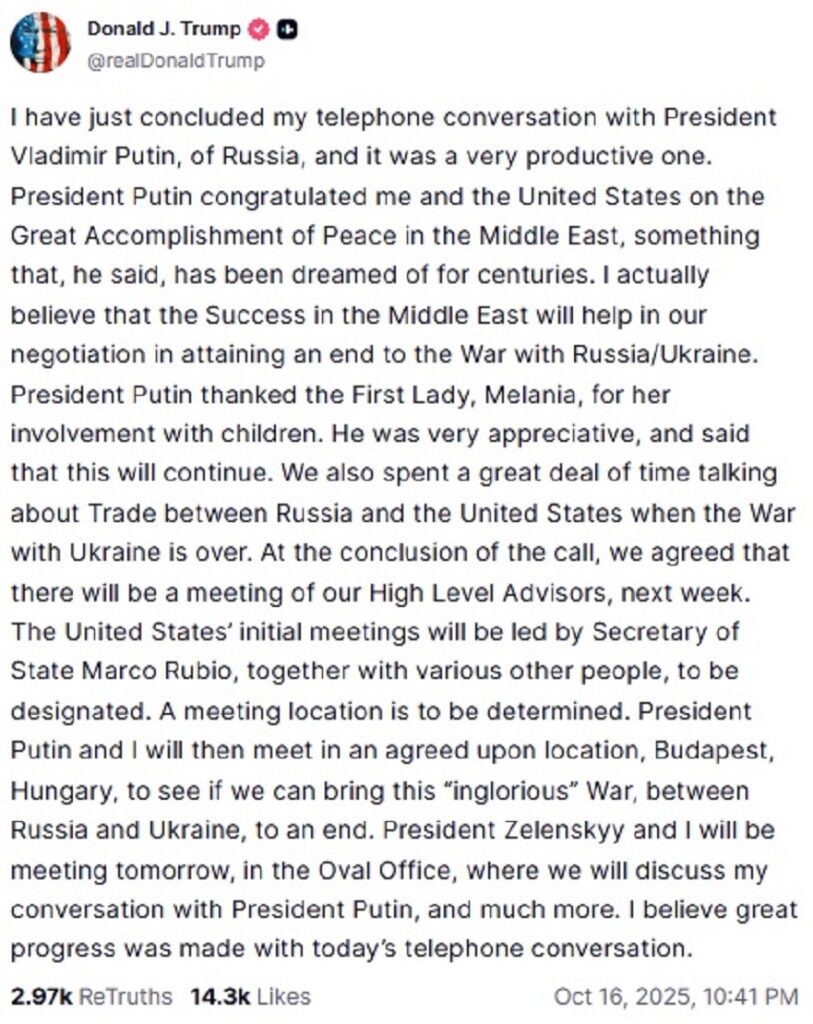 ट्रंप ने कहा कि यह बातचीत बेहद उपयोगी रही और इससे द्विपक्षीय रिश्तों में सकारात्मक गति आई है। उन्होंने विश्वास जताया कि बुडापेस्ट में प्रस्तावित बैठक और जेलेंस्की के साथ होने वाली मुलाकात वैश्विक शांति स्थापित करने में मील का पत्थर साबित होगी।