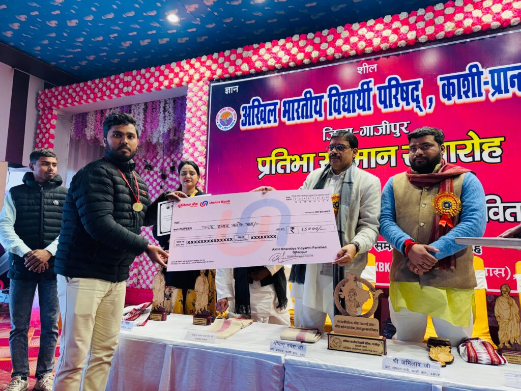 ग़ाज़ीपुर । अखिल भारतीय विद्यार्थी परिषद अभाविप ग़ाज़ीपुर के तत्वावधान में रॉयल पैलेस में प्रतिभा सम्मान समारोह का भव्य आयोजन किया गया। कार्यक्रम में राष्ट्रीय स्वयंसेवक संघ के प्रांत प्रचारक रमेश जी मुख्य अतिथि के रूप में उपस्थित रहे। विशिष्ट अतिथियों के रूप में सपना सिंह जिलापंचायत अध्यक्ष, काशी प्रांत के प्रांत संगठन मंत्री अभिलाष एवं जिला संयोजक बृजेश जी मौजूद रहे। कार्यक्रम की अध्यक्षता पारस नाथ राय की गरिमामयी उपस्थिति रही।